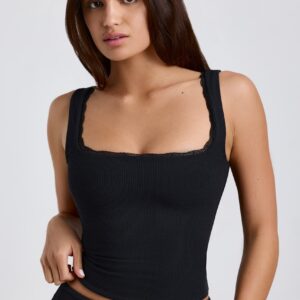 Ribbed Modal Lace-Trim Tank Top in Black